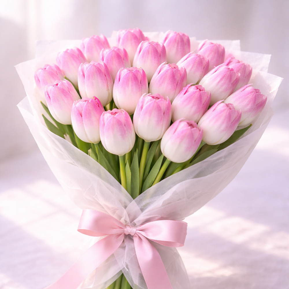 Букет из 25 бело-розовых тюльпанов В наличии Букет из 25 бело-розовых тюльпанов