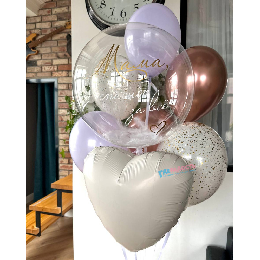 После оформления заказа вы сможете согласовать с нашим менеджером цветовую гамму, изменить состав, добавить или убрать фигуры, а также нанести надписи на шарики.