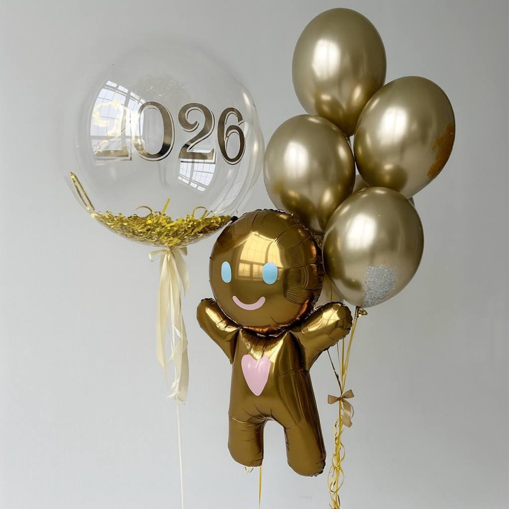 Заказать Композиция из шаров "Золотой Новый Год", с пряником с доставкой в Москве и области. Композиция из шаров "Золотой Новый Год", с пряником - гарантия полета, скидки, акции.