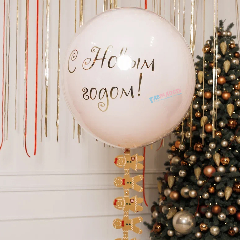 Заказать Стеклянный шар 60 см "С Новым годом", с хвостом из пряничных человечков с доставкой в Москве и области. Стеклянный шар 60 см "С Новым годом", с хвостом из пряничных человечков - гарантия полета, скидки, акции.